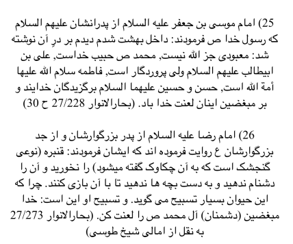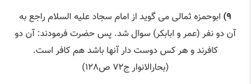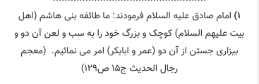 مُحَمَّدُ بْنُ يَحْيَى عَنْ مُحَمَّدِ بْنِ اَلْحُسَيْنِ عَنْ مُحَمَّدِ بْنِ إِسْمَاعِيلَ بْنِ بَزِيعٍ عَنِ اَلْخَيْبَرِيِّ عَنِ اَلْحُسَيْنِ بْنِ ثُوَيْرٍ وَ أَبِيسَلَمَةَ اَلسَّرَّاجِ قَالاَ: سَمِعْنَا أَبَا عَبْدِاَلله عَلَيْهِاَلسَّلاَمُ وَ هُوَ يَلْعَنُ فِي دُبُرِ كُلِّ مَكْتُوبَةٍ أَرْبَعَةً مِنَ اَلرِّجَالِ وَ أَرْبَعاً مِنَ اَلنِّسَاءِ: فُلاَنٌ وَ فُلاَنٌ وَ فُلاَنٌ وَ مُعَاوِيَةُ وَ يُسَمِّيهِمْ وَ فُلاَنَةُ وَ فُلاَنَةُ وَ هِنْدٌ وَ أُمُّاَلْحَكَمِ أُخْتُ مُعَاوِيَةَ.